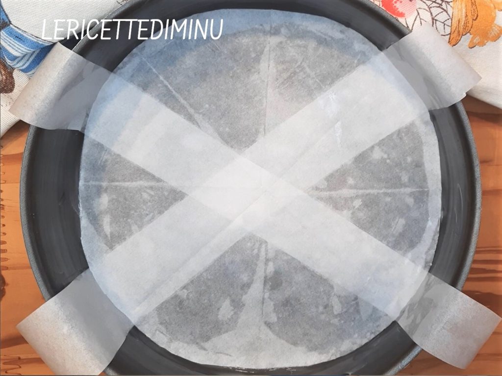 Recouvrir les deux bandes et le fond du moule avec un cercle de papier sulfurisé découpé à la taille.