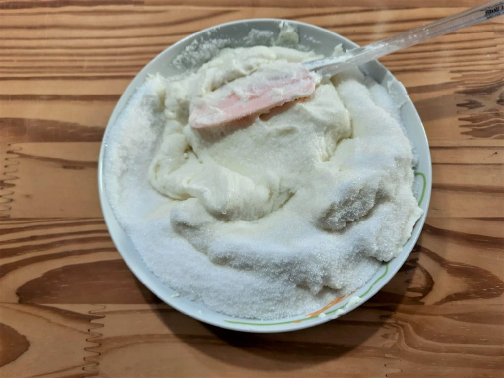 Pesez ensuite la ricotta (désormais sans petit-lait) et, en fonction de son poids, qui sera d’environ 650 g, ajoutez le sucre indiqué dans les ingrédients, mélangez.