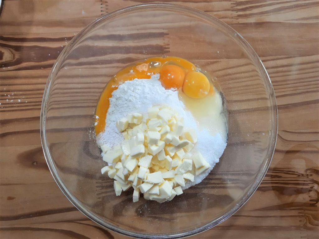 Pendant ce temps, préparez la pâte sablée en mélangeant la farine, le sucre, la vanilline, la levure tamisée, l’œuf entier et les deux jaunes d’œufs, une pincée de sel et le beurre (désormais à température ambiante).