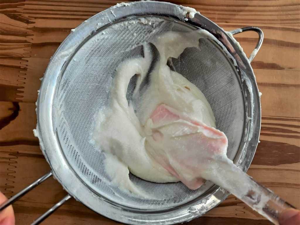 Sortez du frigo la ricotta sucrée, passez-la deux fois au tamis à l’aide d’une spatule en silicone.
