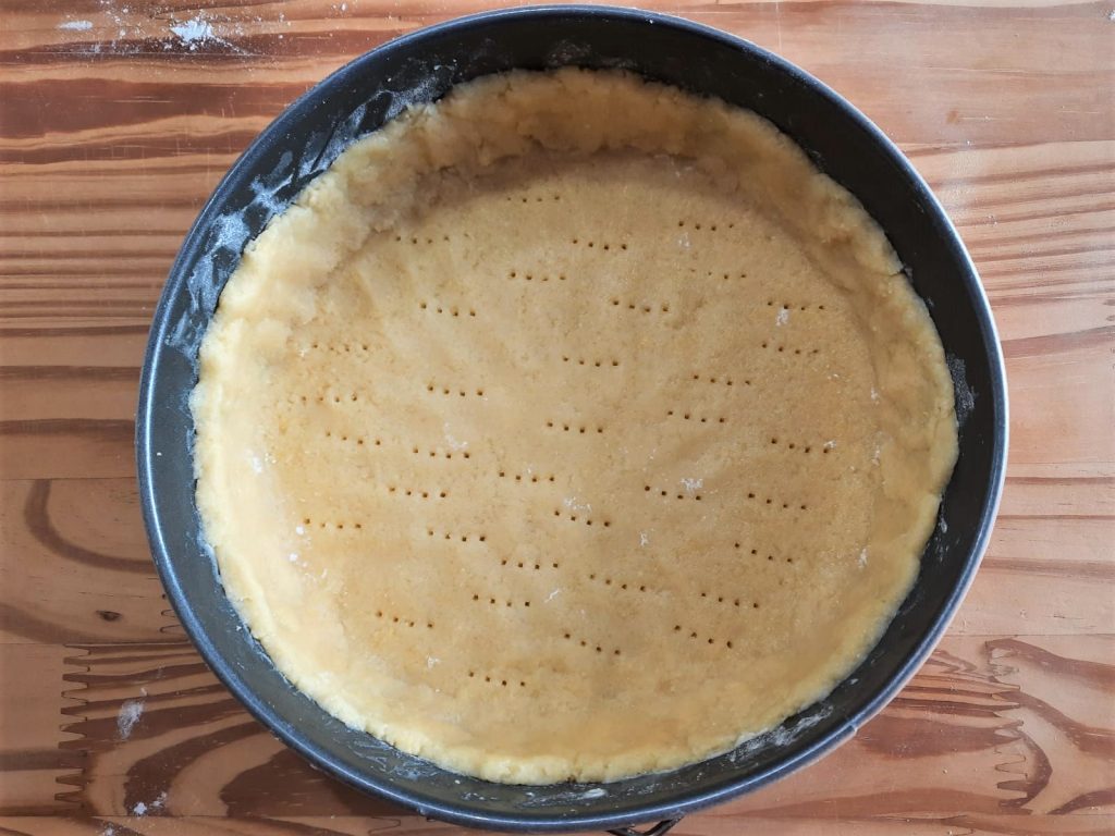 Créez un bord haut de pâte sablée et piquez la base avec une fourchette. Saupoudrez la base de 2 cuillères à soupe de chapelure rase.