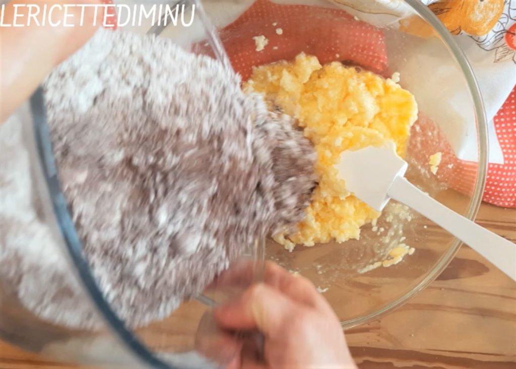 Pour préparer la tarte au cacao avec confiture de fraises, commencer par tamiser la farine avec le cacao amer et la levure et mettre de côté.