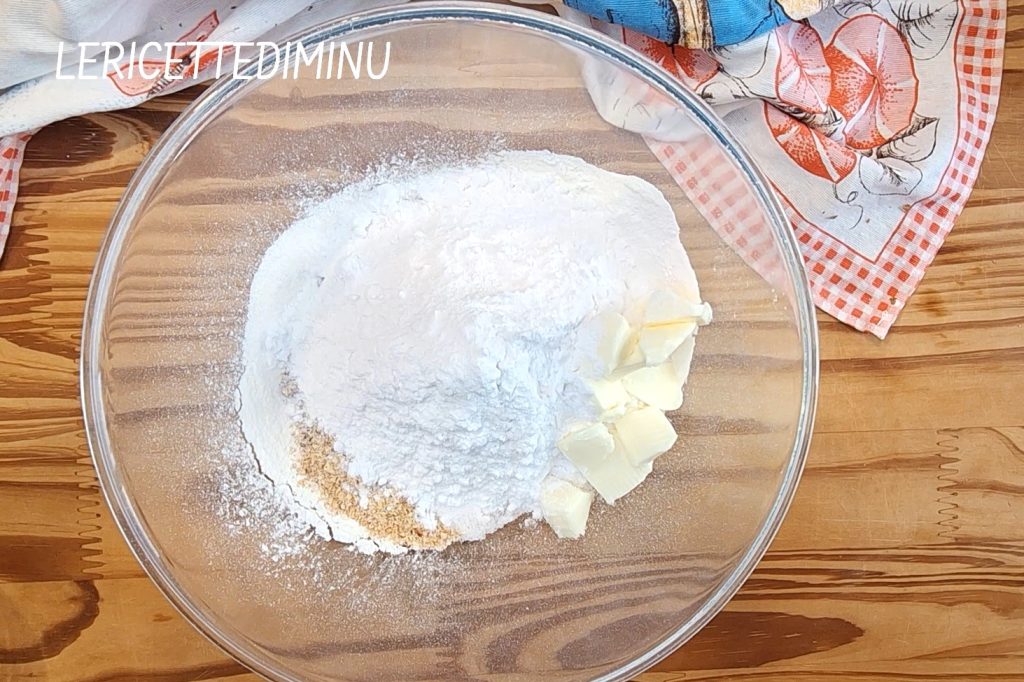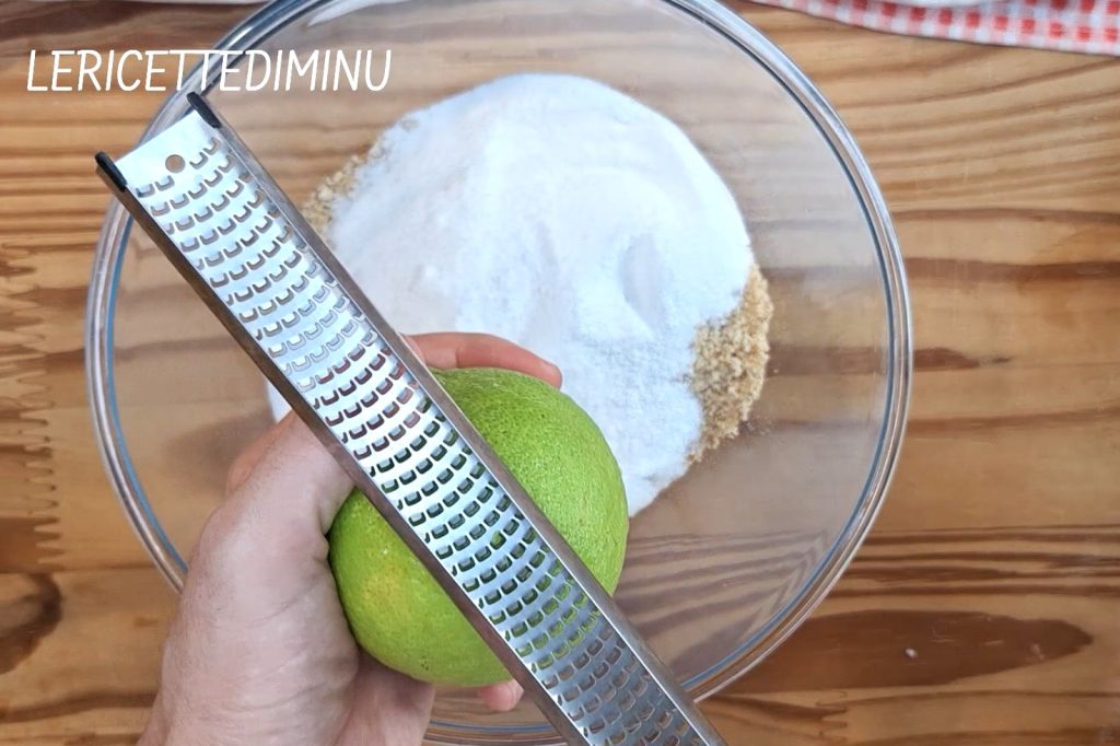 Pour préparer la garniture, dans un bol, travailler avec une spatule en silicone, la farine de noisettes avec le sucre glace, les œufs, la peau d’un citron non traité, la levure et une petite cuillère d’essence de vanille.