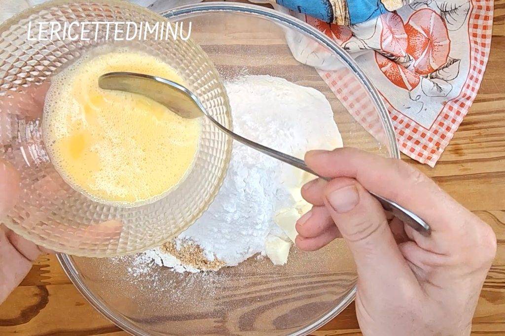 Pétrir ensemble la farine 00 et celle de noisettes prévue pour la pâte sablée, le sucre glace, le beurre ramolli en cubes, une demi-cuillère à café d’essence de vanille, la levure, le sel fin et un demi-œuf battu.