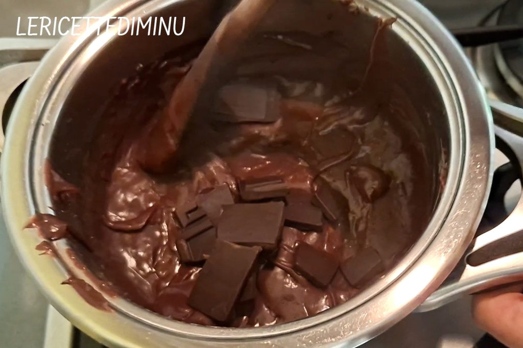 • Feu éteint, retirer le zeste d’orange et ajouter immédiatement à la crème le chocolat noir en morceaux.