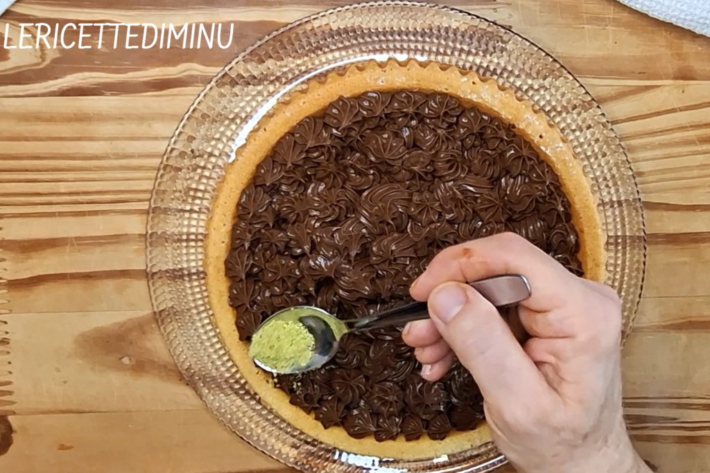 Pour rendre le dessert plus élégant, on peut ajouter une décoration comme une légère saupoudrée de poudre de pistache ; le contraste entre le vert du pistache et le brun du chocolat rendra la tarte encore plus appétissante.