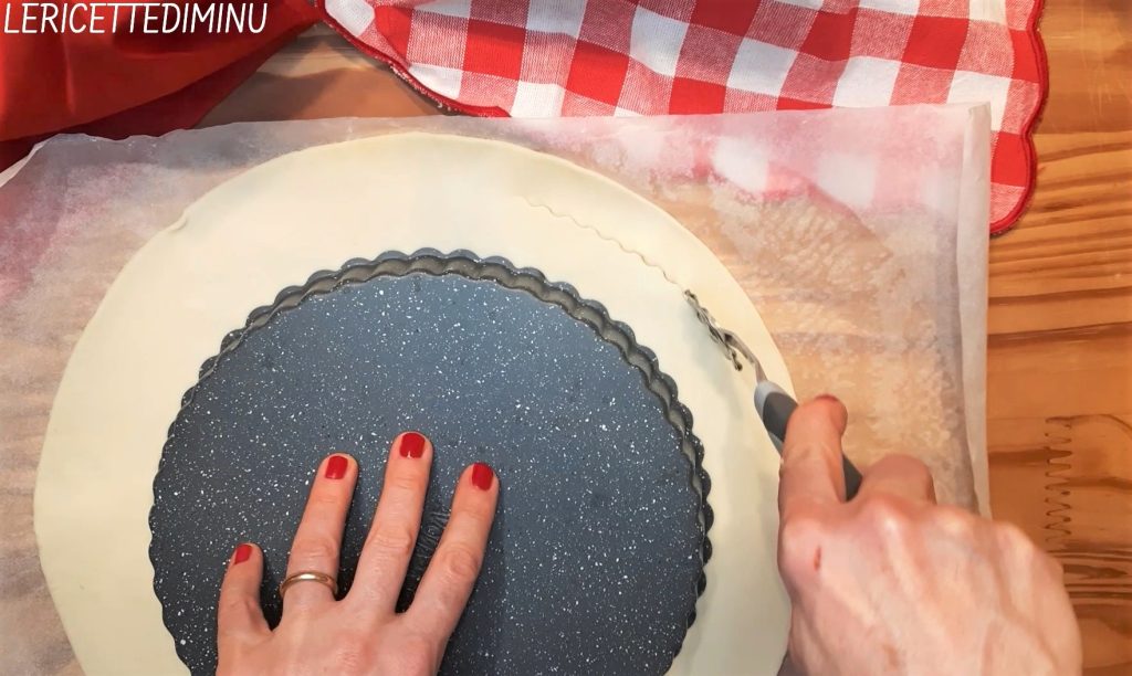 • Dérouler un disque de pâte feuilletée et en le laissant attaché à son papier sulfurisé, le transférer dans un moule à tarte en mettant de côté l’excédent de pâte pour faire les bandes.