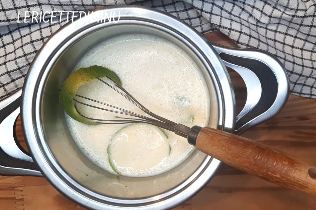 Lorsque nous avons obtenu un mélange homogène et sans grumeaux, ajouter le zeste de citron non traité coupé en bandes. Ensuite, placer la casserole sur le feu et à feu moyen, porter à ébullition.