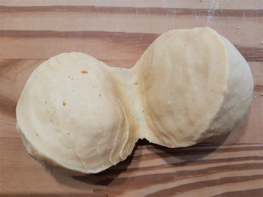 Commencez à pétrir sur un plan de travail et continuez pendant environ 15 minutes, jusqu’à ce qu’en coupant la pâte, on voit des bulles d’air à l’intérieur.