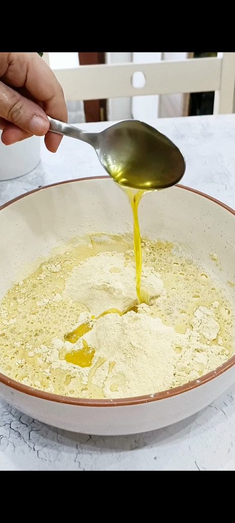 Préparez d’abord les gnocchis de pois chiches en versant dans un bol la farine de pois chiches et en ajoutant l’eau tiède, l’huile et une pincée de sel.