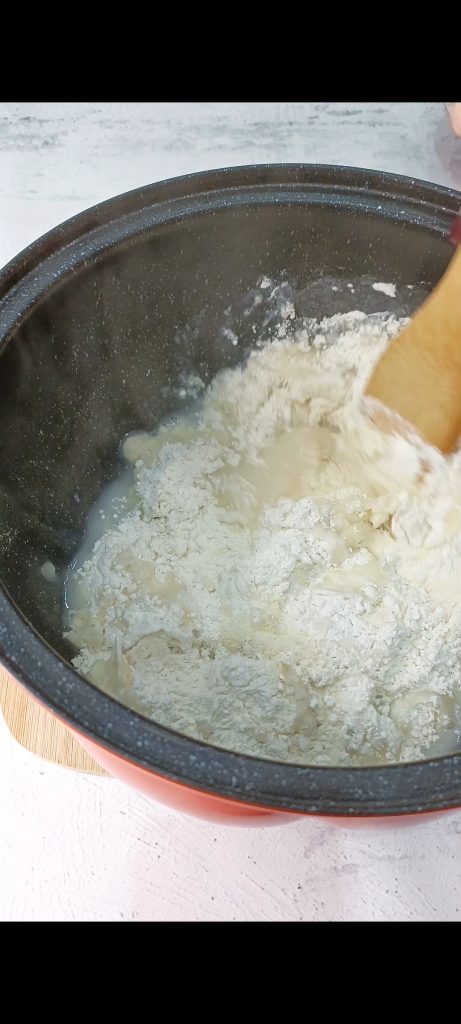 Remuez rapidement avec une cuillère jusqu’à ce qu’une boule se forme et se détache des parois de la casserole.