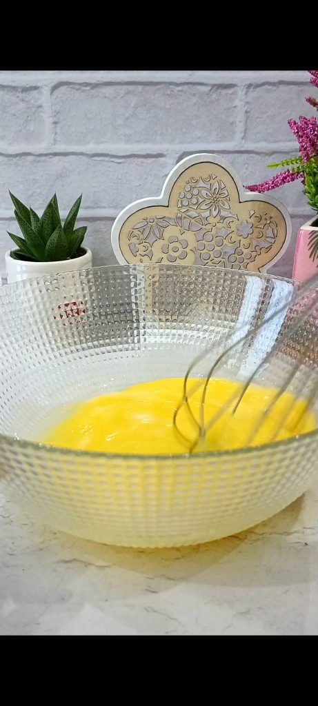 • Préparez la pâte : dans un grand bol, battez les œufs avec le sucre jusqu’à obtenir un mélange clair et homogène. Ajoutez le lait, l’extrait de vanille et le beurre fondu refroidi. Mélangez bien.