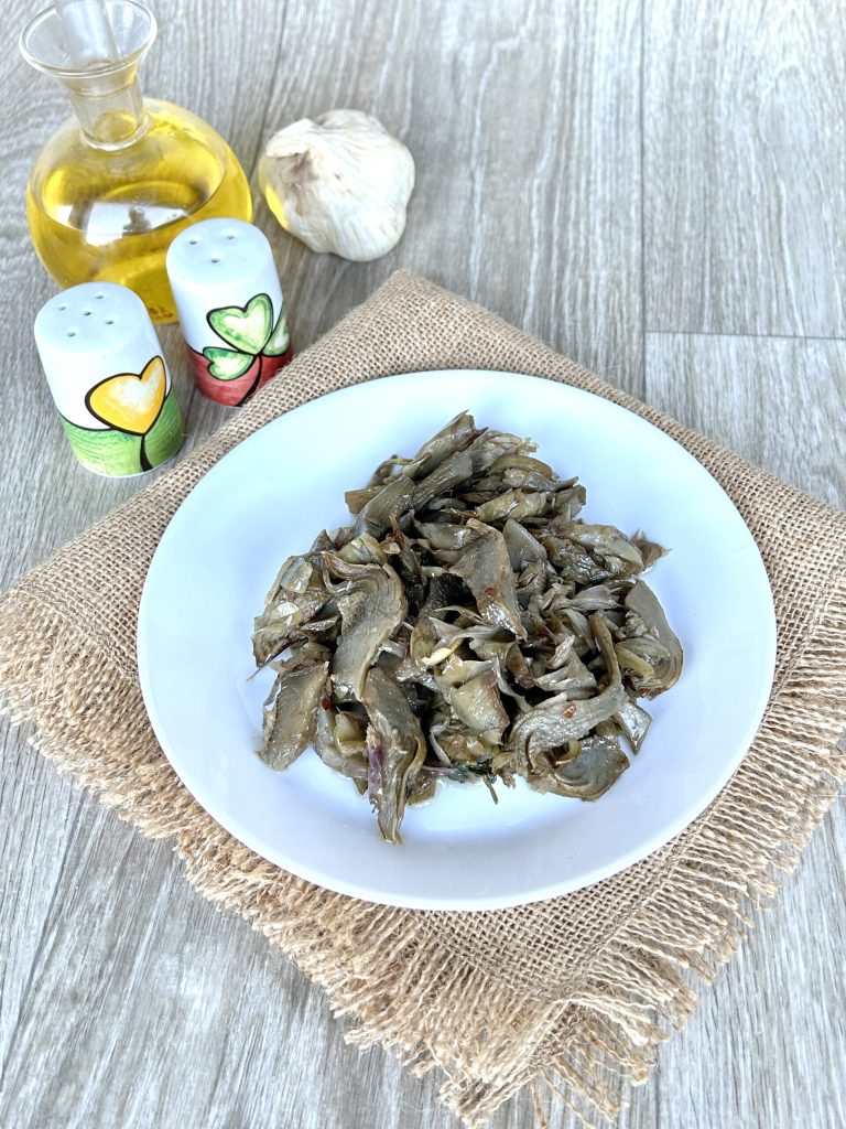 • une fois les artichauts nettoyés, coupez-les en quartiers et mettez-les dans la poêle, ajoutez l’ail émincé, le sel, le piment, le persil haché et l’eau. Couvrez bien avec le couvercle et mettez le tout sur le feu vif pendant les cinq premières minutes, en remuant de temps en temps. Quand vous voyez que les artichauts commencent à être un peu rosés, baissez le feu et continuez la cuisson jusqu’à ce qu’ils soient tendres et facilement piqués avec une fourchette. Il faudra environ 20 minutes au total.