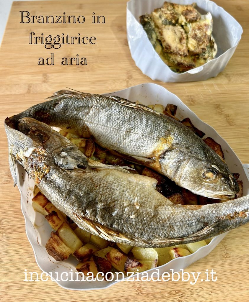 Je préfère insérer le bar dans la friteuse parmi les pommes de terre sans l’envelopper de papier sulfurisé ou d’aluminium, comme je le fais dans le four classique, car la cuisson rapide de la friteuse à air me permet d’obtenir un poisson bien cuit mais pas sec à l’intérieur.