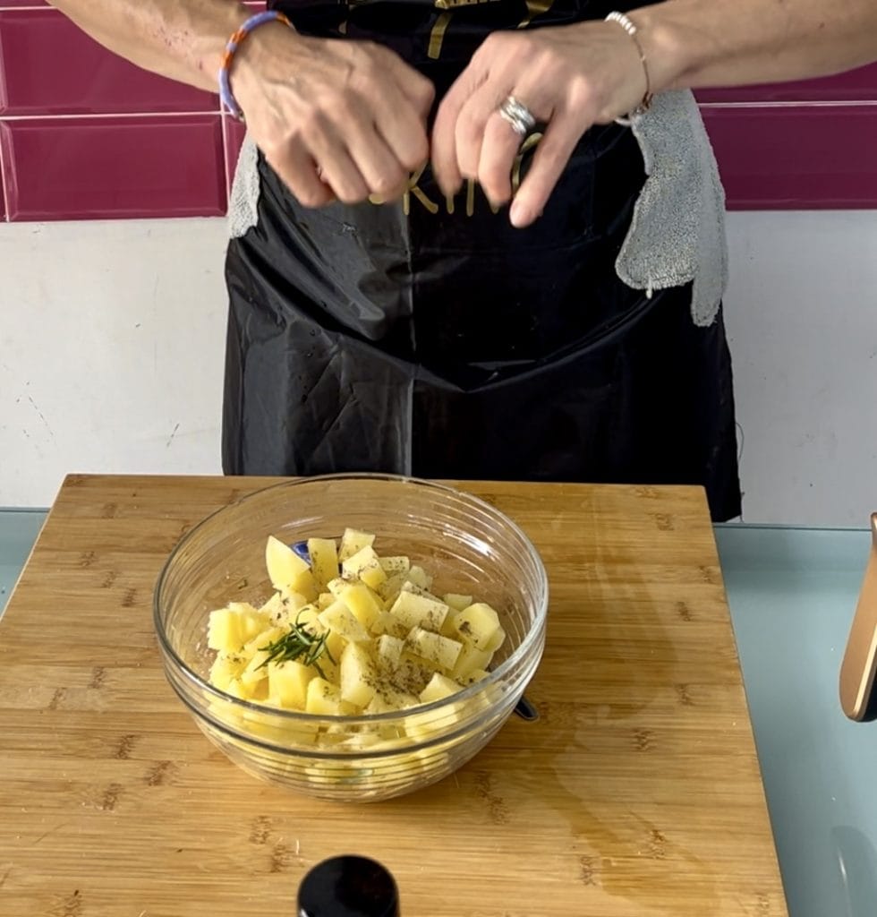Épluchez les pommes de terre et lavez-les bien sous l’eau courante. Aidez-vous d’une planche à découper et d’un couteau à lame lisse pour les couper en cubes pas trop gros et placez-les dans le bol en verre. Assaisonnez les pommes de terre avec du sel, du poivre, deux gousses d’ail et l’huile. Mélangez bien les pommes de terre et transférez-les dans le panier de la friteuse avec le moule en silicone approprié.