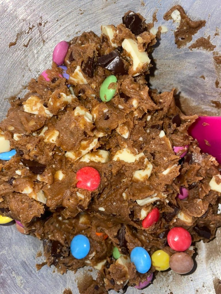 • La première chose à faire est de faire fondre le beurre, vous pouvez le passer tranquillement environ 30″ au micro-ondes et il sera parfait pour la recette. Mettez le beurre fondu dans le bol, ajoutez tout le sucre et commencez à mélanger, ajoutez l’œuf, la farine, le bicarbonate, l’arôme de vanille, le chocolat blanc et noir, tous deux préalablement cassés en morceaux, et enfin, ajoutez les smarties. Ne travaillez pas trop la pâte pour ne pas la réchauffer trop, elle doit simplement être tout mélangée comme vous le voyez en photo.