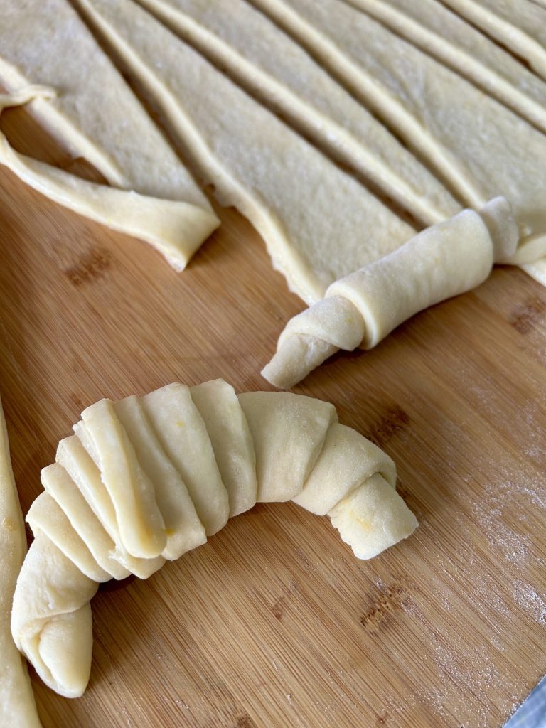 Roulez chaque triangle sur lui-même en partant de la base incisée, cette incision servira justement à diriger les bords classiques du croissant vers l’extérieur.