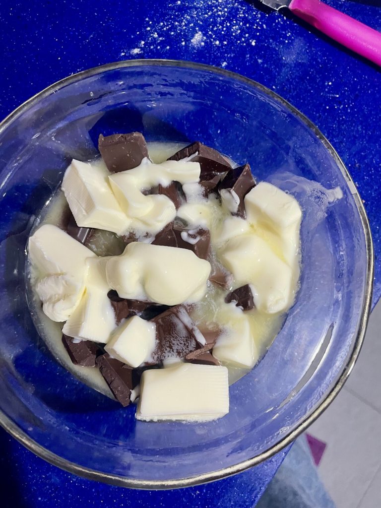 Dans un bol, mettez le chocolat noir et le chocolat au lait en morceaux, ajoutez le beurre et faites fondre le tout au bain-marie ou au micro-ondes. Si vous utilisez le micro-ondes, rappelez-vous après environ 30 secondes d’éteindre, de remuer avec un couteau le chocolat et de continuer ainsi jusqu’à ce qu’il soit complètement fondu, ça devrait être suffisant environ une minute ou un peu plus.