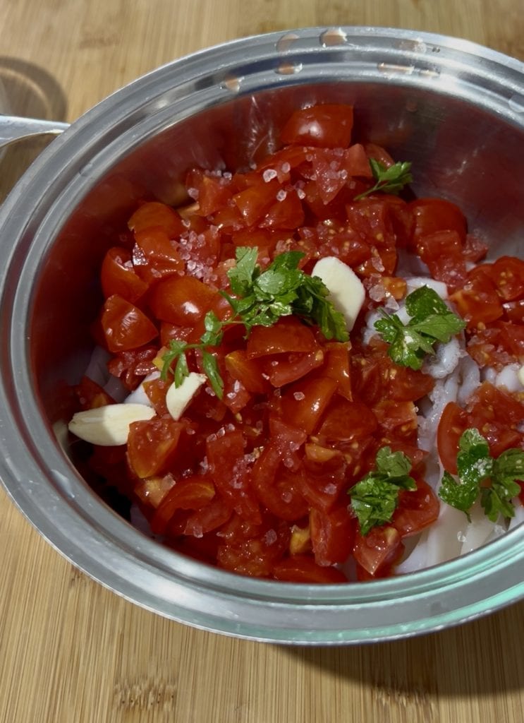 Dans une grande casserole, ajoutez les calamars déjà coupés, les tomates fraîches lavées et coupées en morceaux, et une gousse d’ail divisée en au moins quatre parties.