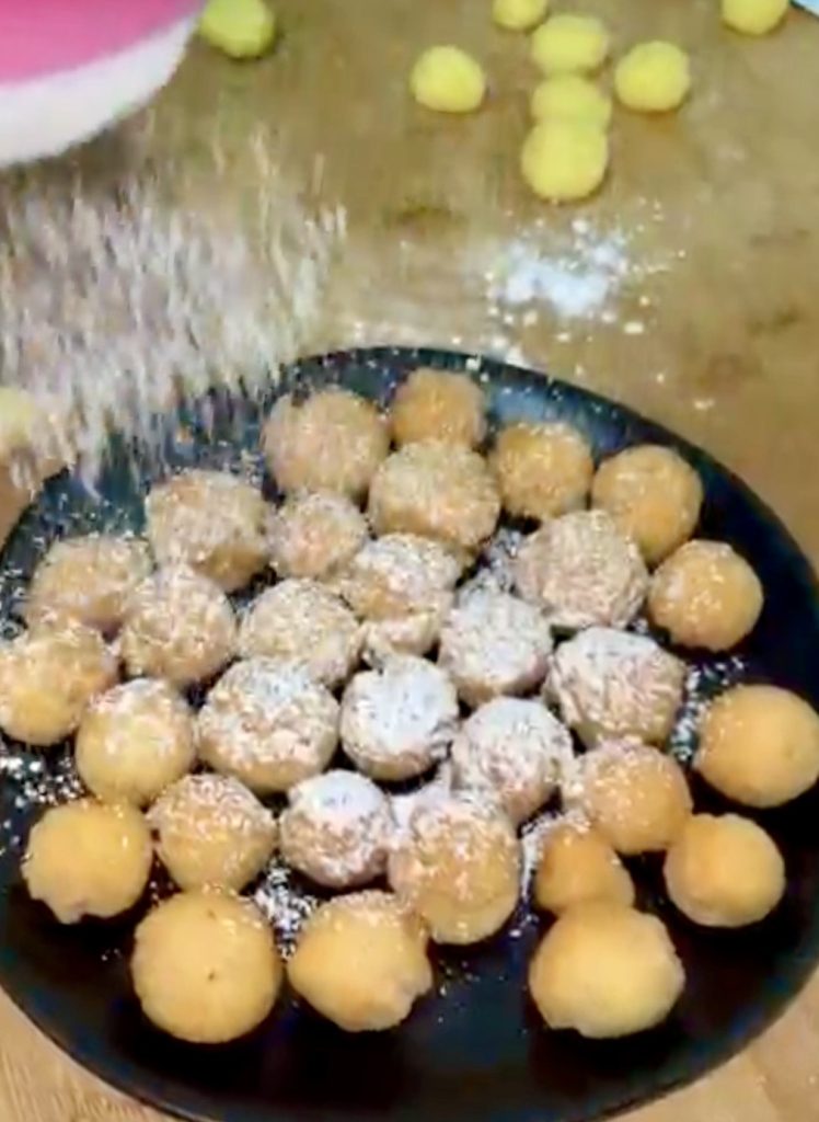Le résultat, ce sont des castagnoles plus compactes, à former comme des gnocchis, à rouler entre les mains puis à plonger dans l’huile bouillante, où elles deviennent dorées, croustillantes à l’extérieur et friables à la morsure.