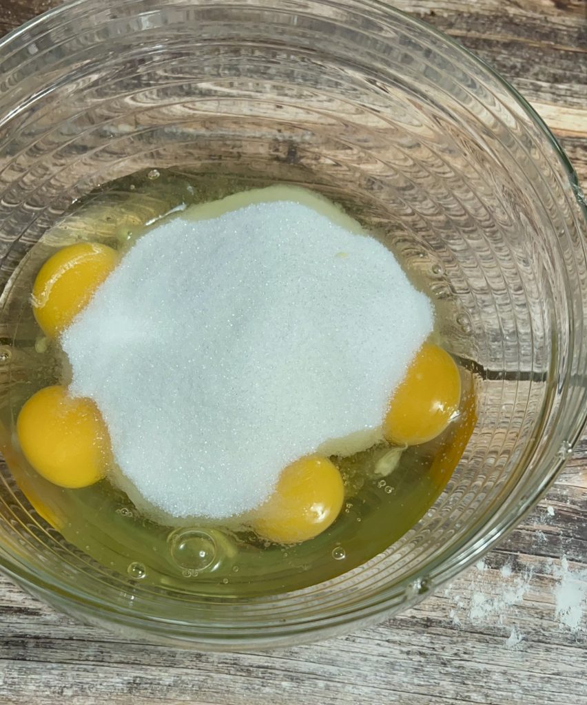 1. Dans un grand bol, cassez les œufs et ajoutez le sucre. Fouettez avec le batteur électrique pendant quelques minutes jusqu’à obtenir un mélange clair et mousseux.