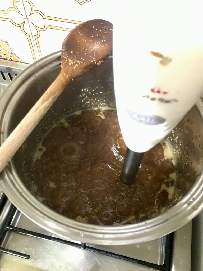 • Après 45′, je vous conseille d’utiliser un mixeur directement dans la casserole pour mixer la confiture et la rendre homogène. Vous vous rendrez compte que votre confiture est prête lorsque vous en prendrez une pointe de cuillère à café et que vous la refroidirez pour trouver la consistance qui vous plaît, si elle est trop liquide, laissez-la encore mijoter.