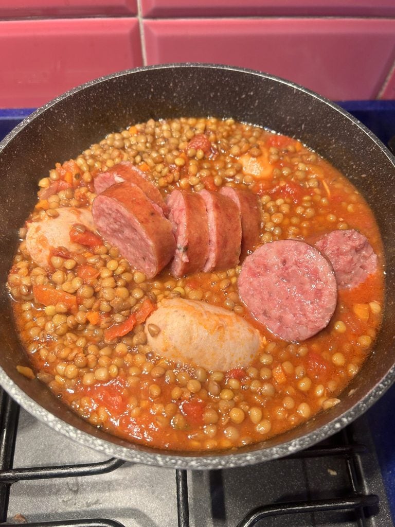Sur la photo, vous voyez également des saucisses parce qu’à la maison tout le monde ne mange pas le cotechino, donc pour eux après le soffritto, j’ajoute quelques saucisses, je les fais dorer et puis j’ajoute la tomate.