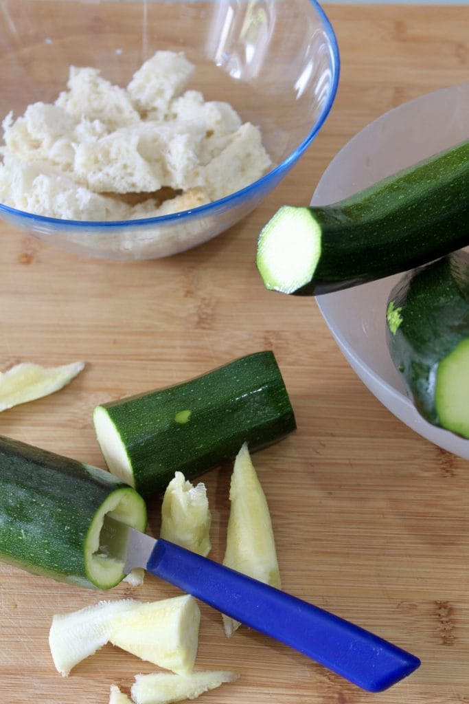 • Nous commençons la préparation en trempant le pain dans le lait et en le laissant bien ramollir. Pendant ce temps, nous lavons les courgettes, éliminons les extrémités et les vidons de leur pulpe interne, en nous aidant d’une cuillère parisienne ou d’un simple couteau de cuisine. Nous essayons de retirer autant de pulpe que possible, mais en prenant soin de ne pas percer les courgettes.