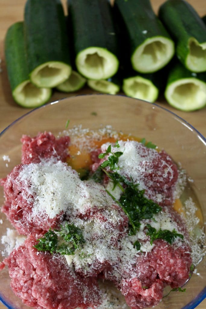 • Après avoir nettoyé toutes les courgettes, nous passons à la préparation de la farce. Dans un saladier, nous mettons la viande hachée, ajoutons le pain bien essoré et l’émiettons directement sur la viande. Nous ajoutons ensuite une pincée de sel, du poivre, du persil haché, une gousse d’ail coupée en petits morceaux, le parmesan râpé et deux œufs. Nous mélangeons le tout avec les mains jusqu’à obtenir une pâte homogène. Avec la farce à base de viande, nous remplissons nos courgettes. Nous pouvons le faire facilement en utilisant les doigts pour pousser bien le mélange à l’intérieur, ou, si vous préférez, vous pouvez vous aider d’une cuillère ou même d’une poche à douille sans embout : ce sera encore plus simple et rapide.