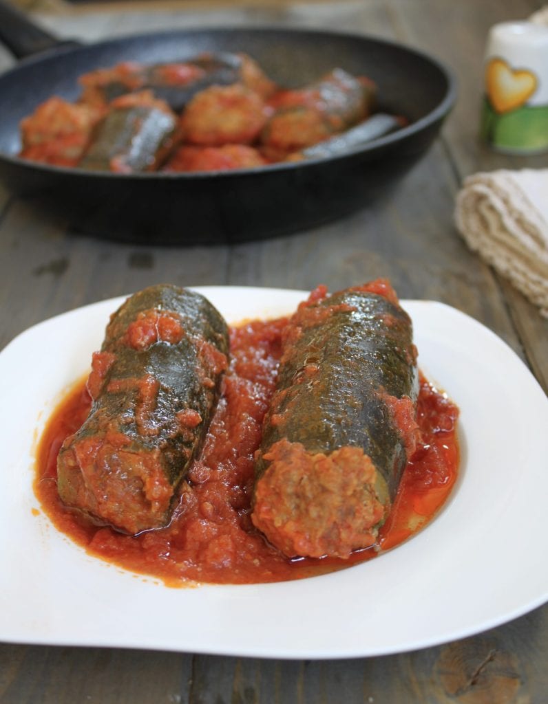 • Au fur et à mesure que vous remplissez les courgettes, disposez-les directement dans une grande poêle. Une fois toutes terminées, versez la pulpe de tomate, ajoutez un peu d’eau, salez, ajoutez une pincée de piment et un filet d’huile d’olive extra vierge. Couvrez avec le couvercle et mettez sur le feu. Portez à ébullition à feu vif, puis baissez légèrement et laissez cuire pendant environ 30 minutes.