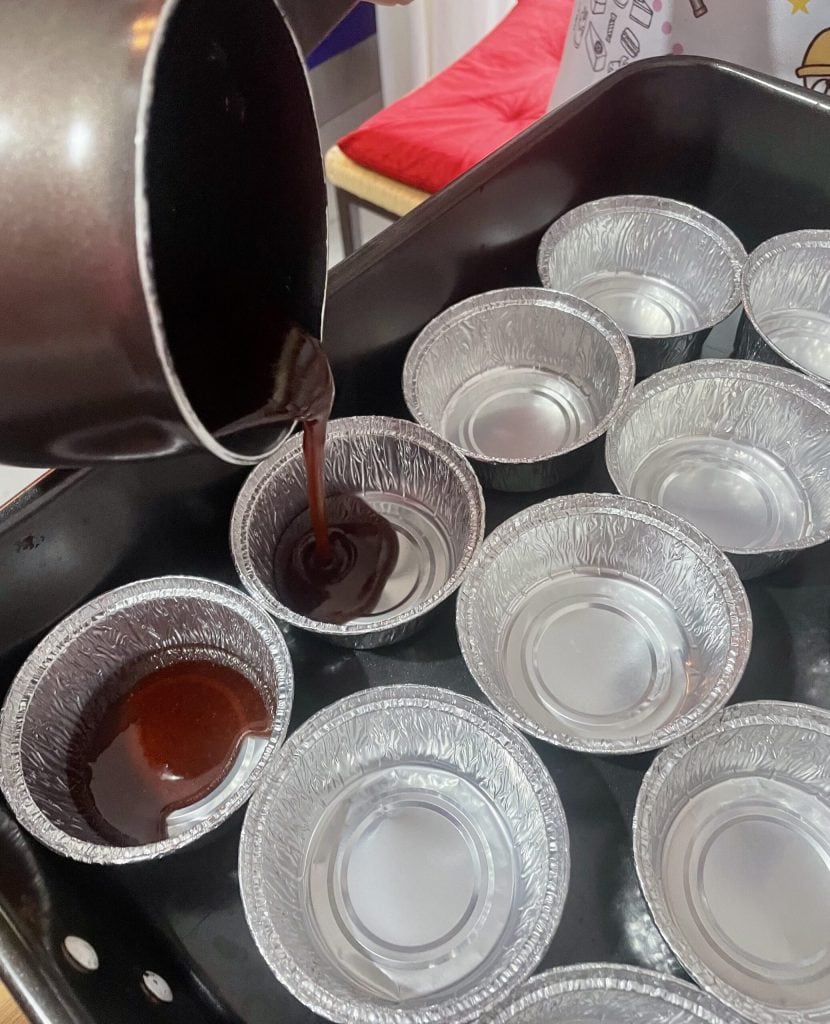Avec une louche, verse délicatement le mélange dans les moules préalablement recouverts de caramel.