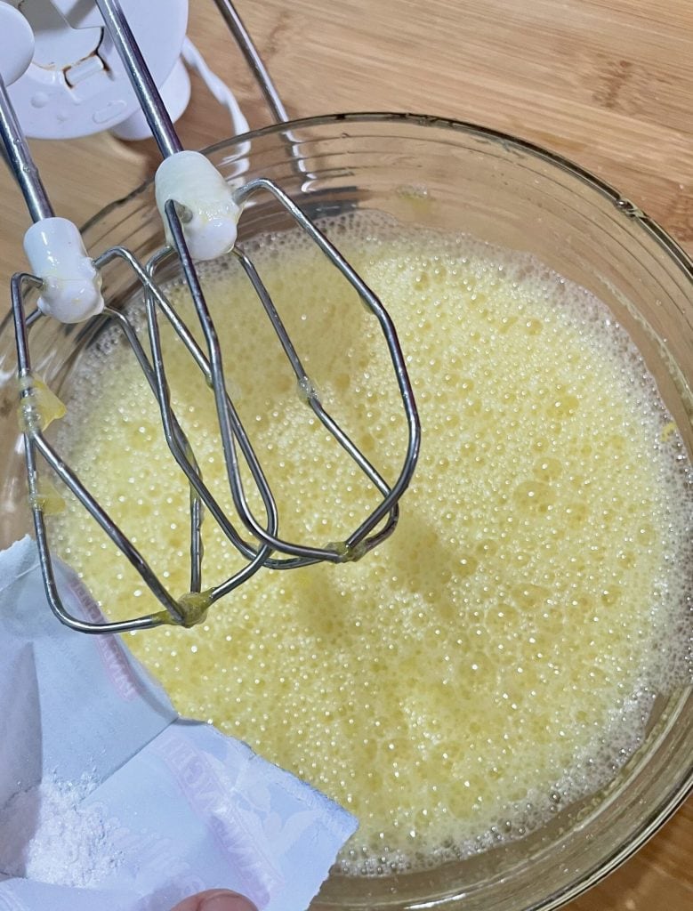 Dans un bol, bats les œufs entiers avec le sucre à l’aide d’un fouet, en mélangeant délicatement pour ne pas incorporer trop d’air. Le mélange ne doit pas devenir mousseux. Ajoute la vanilline ou l’arôme de vanille.