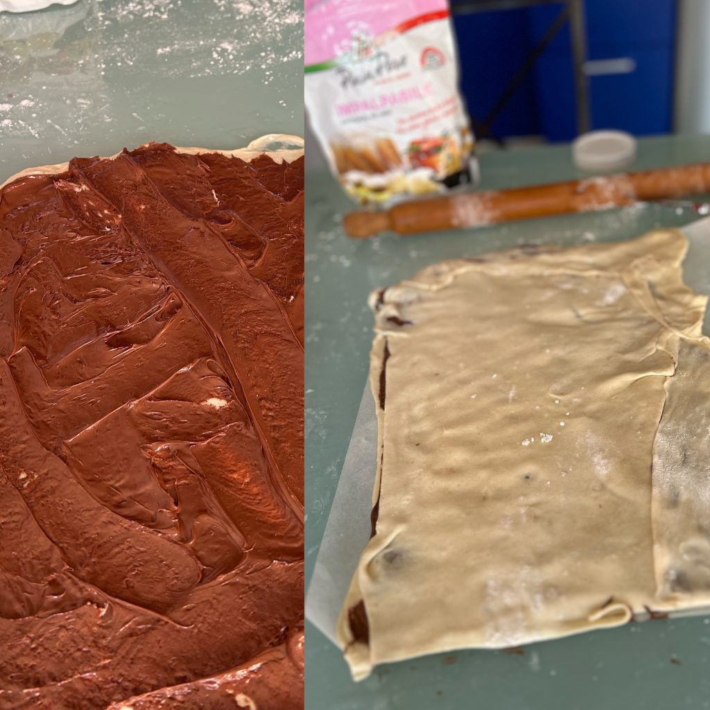 Bien sûr, les croissants feuilletés peuvent être garnis avec la crème ou la confiture de votre choix, l’important est de couvrir toute la surface du premier rectangle avec une couche pas trop épaisse de crème.