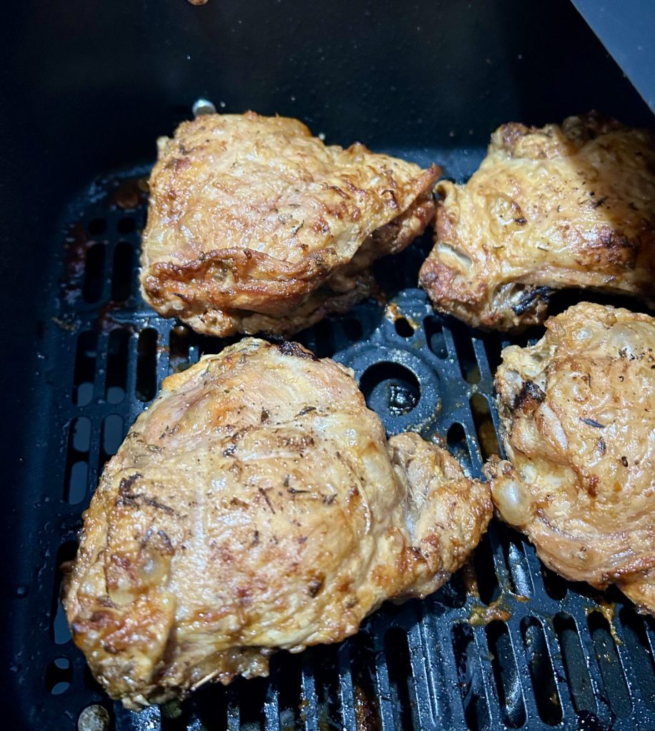 Disposez les cuisses dans le panier de la friteuse à air avec la peau vers le bas.