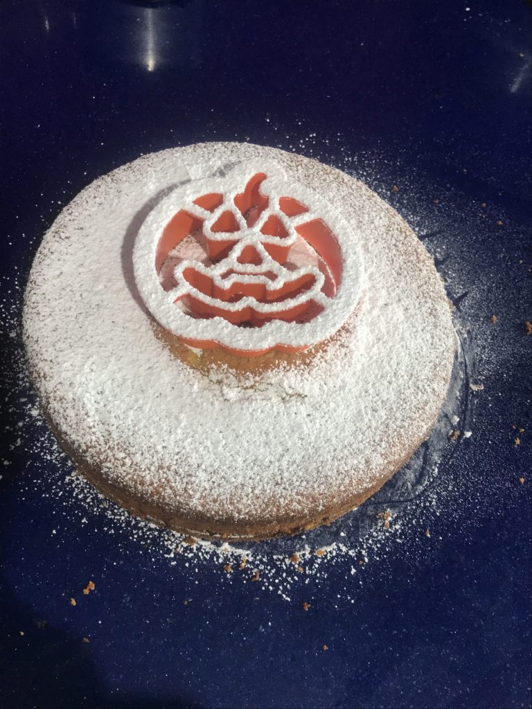 • Une fois refroidi, retirez le gâteau du moule, positionnez au centre le moule ou l’emporte-pièce en forme de citrouille (vous pouvez utiliser la forme d’Halloween que vous préférez) et saupoudrez de sucre glace en vous aidant d’un tamis.