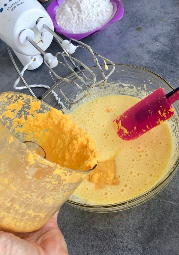 Important pour la réussite du gâteau : bien mixer la citrouille avec le lait et l’huile, et je recommande un bon mixeur que vous pourrez ensuite utiliser avec le fouet pour pétrir le reste des ingrédients.