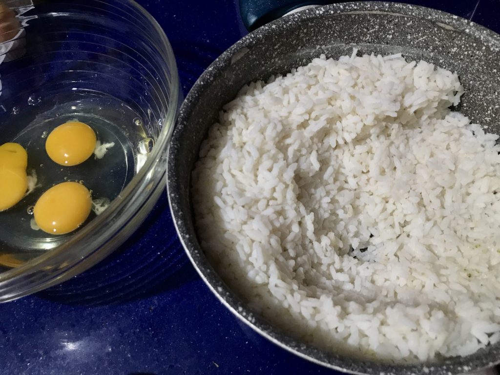 Partant du riz déjà bouilli et refroidi, mettez dans un bol les œufs et ajoutez le sucre.