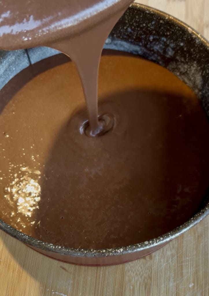 À ce stade, il ne nous reste plus qu’à cuire notre gâteau ! La pâte sera assez fluide, donc préparez un moule de 20 cm, de préférence à charnière pour démouler plus facilement le gâteau. Sinon, un moule antiadhésif convient également.