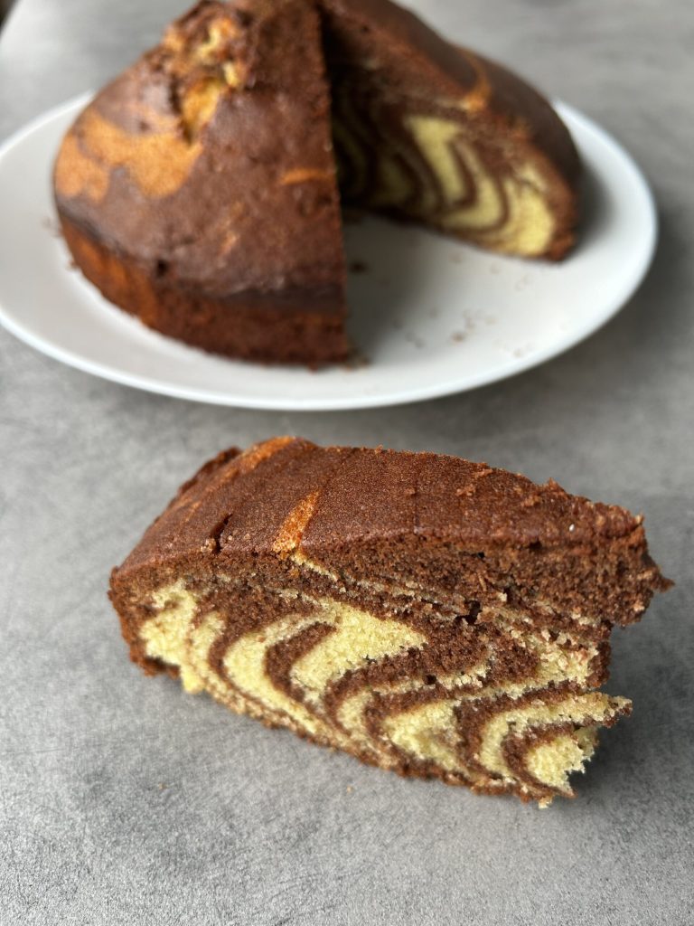 Le gâteau zébré sera un gâteau compact mais moelleux à l’intérieur et restera ainsi moelleux pendant plusieurs jours s’il est maintenu à température ambiante dans un porte-gâteau classique avec couvercle.