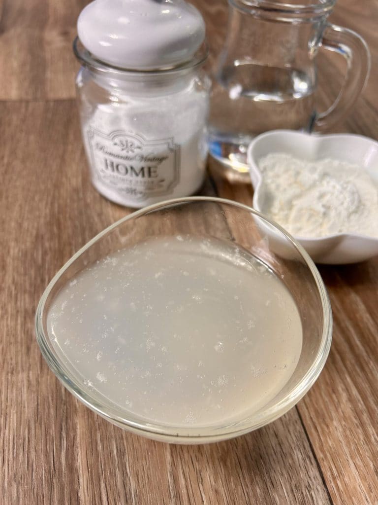 Lorsque l’eau avec le sucre atteint l’ébullition, ajoutez toute la fécule et mélangez pendant environ deux minutes, vous verrez la gélatine devenir opaque et légèrement épaisse comme sur la photo. Votre gélatine pour tartes est prête.