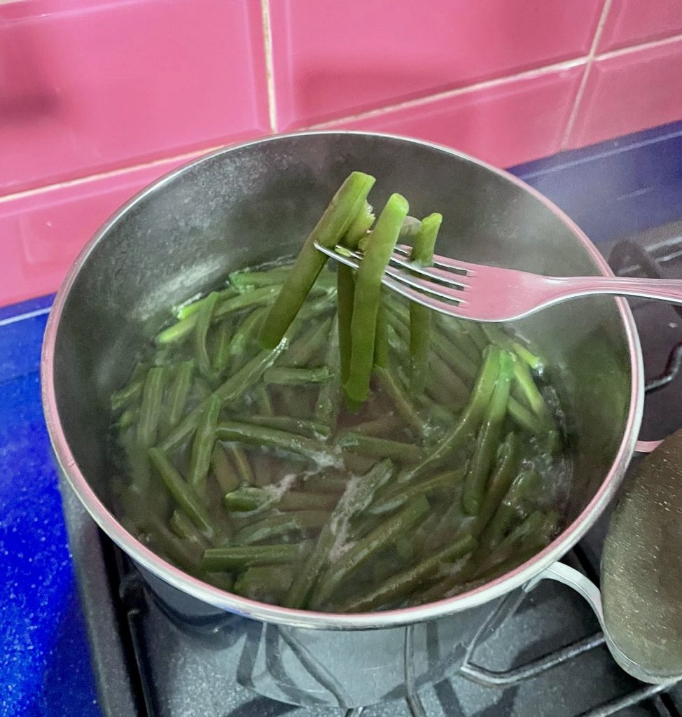 Portez les haricots verts lavés dans l’eau lorsqu’elle atteint l’ébullition et laissez-les cuire environ 20 minutes ou plus si vous les voulez bien tendres.