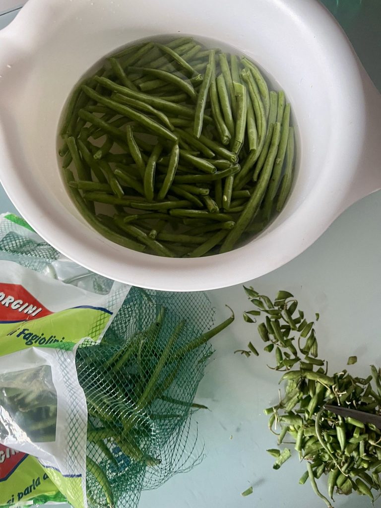 La première étape consiste à nettoyer et bien laver les haricots verts. Pendant que vous mettez la marmite sur le feu avec l’eau et le gros sel pour la porter à ébullition, retirez les extrémités des haricots verts avec le bout des doigts et non avec le couteau et mettez-les dans un bol avec de l’eau et du bicarbonate. Je vous déconseille d’utiliser le couteau pour couper les extrémités car cela permet de vérifier si certains haricots ont le fil extérieur gênant qui, en coupant les pointes avec les doigts, sera enlevé automatiquement et ainsi vous ne le retrouverez pas dans l’assiette.