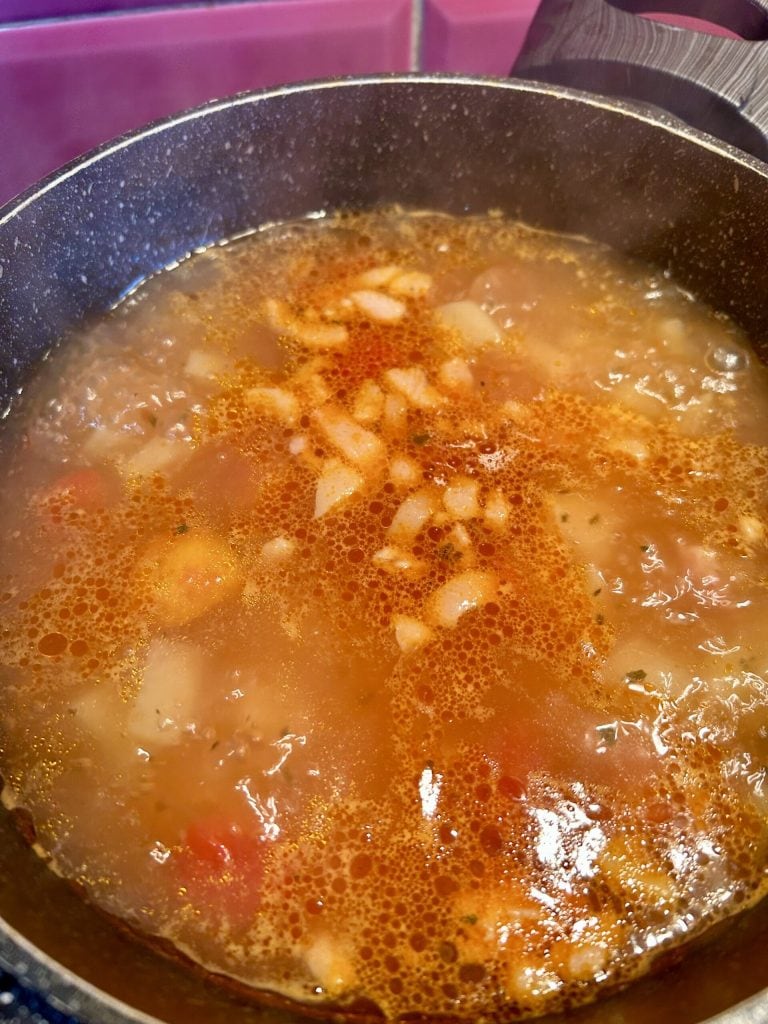 Pour la cuisson des pâtes, je recommande toujours d’utiliser une petite casserole, où verser une partie du bouillon et cuire les pâtes directement dedans. Ensuite, servez et ajoutez le bouillon à votre goût, selon les préférences de chaque convive. Certains la préfèrent plus sèche et d’autres plus en bouillon. S’il reste du bouillon, il est excellent même consommé avec de simples croûtons de pain, pour un plat encore plus savoureux.