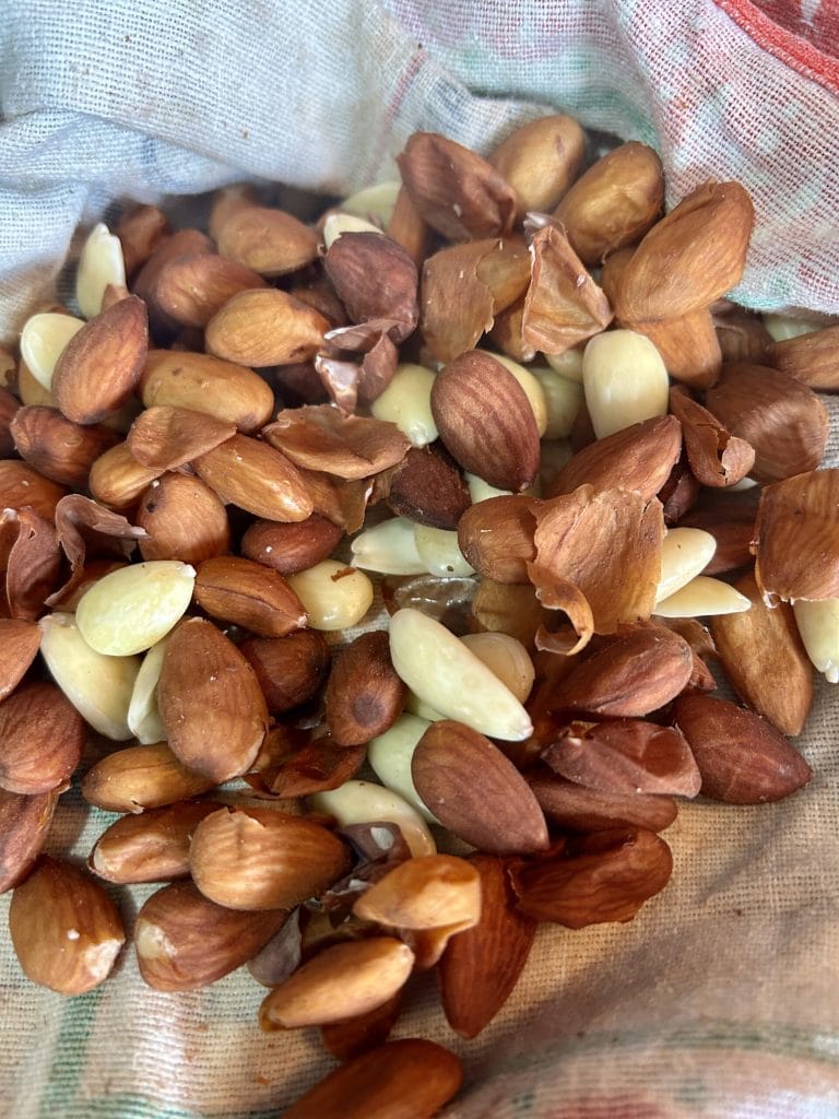 Égouttez les amandes avec une passoire et transférez-les sur un torchon. Avec le torchon, frottez-les vigoureusement pour ramollir la peau. Après cette étape, en ouvrant le torchon, vous trouverez déjà quelques amandes décortiquées ; les autres se pèlent facilement en les pressant entre les doigts.