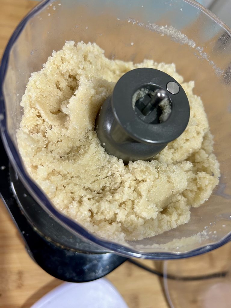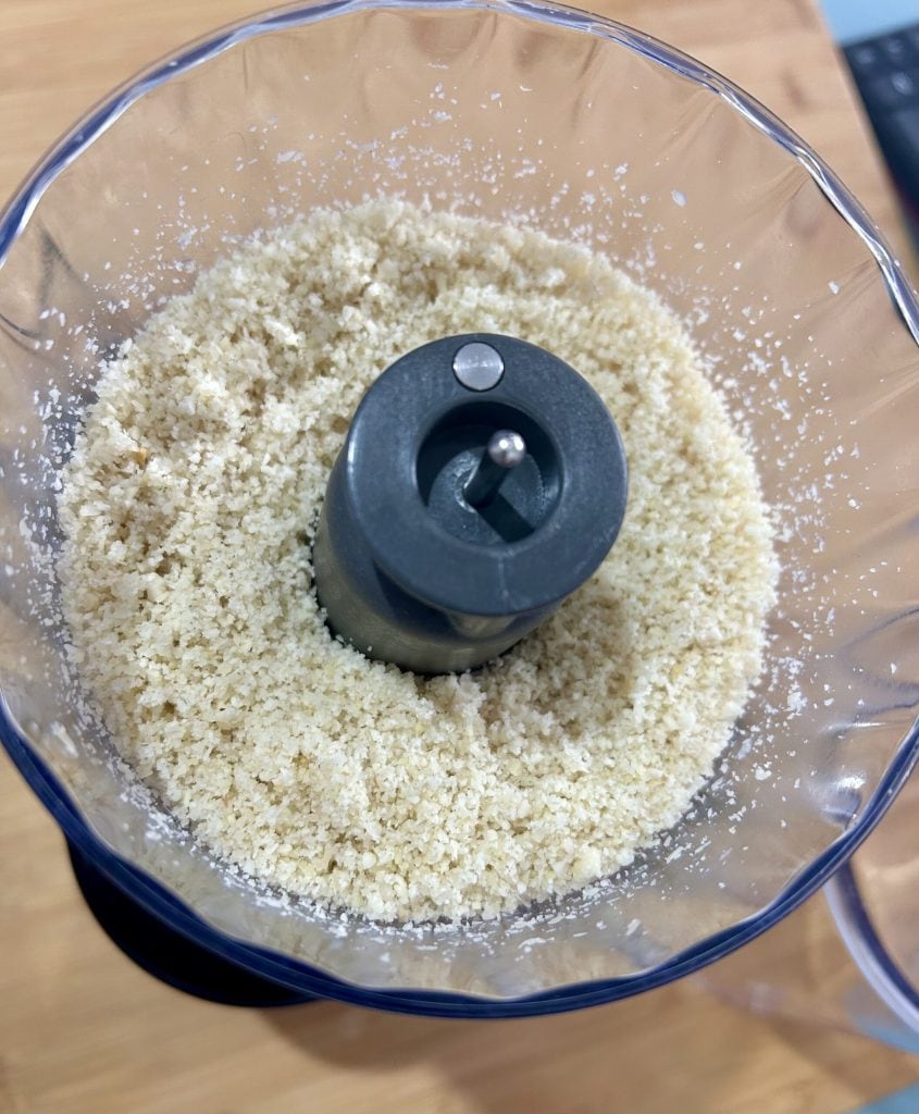 Mettez les amandes pelées directement dans le hachoir et broyez-les jusqu’à obtenir une consistance semblable à de la farine. Ne les broyez pas trop longtemps, juste le temps nécessaire pour les hacher.