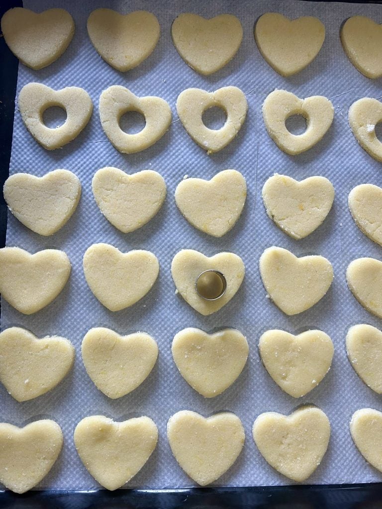 • Si vous souhaitez préparer des biscuits fourrés, suivez ma méthode : choisissez un emporte-pièce de la forme que vous préférez et découpez un nombre pair de biscuits. Sur la moitié d’entre eux, faites un petit cercle au centre de la pâte. Après la cuisson, vous étalerez la garniture sur le biscuit entier et le couvrirez avec celui découpé. Pour les biscuits, je vous conseille de les cuire au four à 180° pendant environ 10 minutes. Si vous utilisez la pâte pour une tarte, la cuisson sera d’environ 20 minutes.
