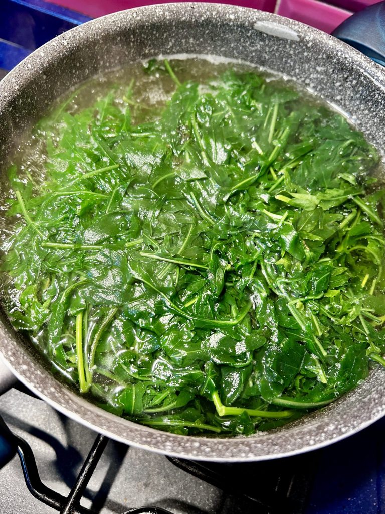 Pendant que la roquette cuit, dans la poêle où vous sauterez ensuite les pâtes, faites revenir l’ail et le piment avec l’huile. Quand l’ail est doré, faites revenir à feu vif la roquette dans la poêle pendant environ deux minutes et ajustez le goût avec le sel fin.