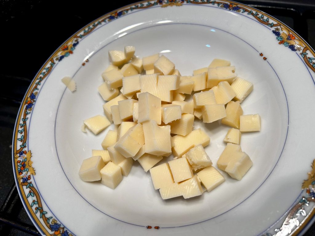 Au cours des différentes étapes, préparez tout le fontina prévu par la recette en dés, prêt à être versé dans la poêle au moment de sauter les pâtes.