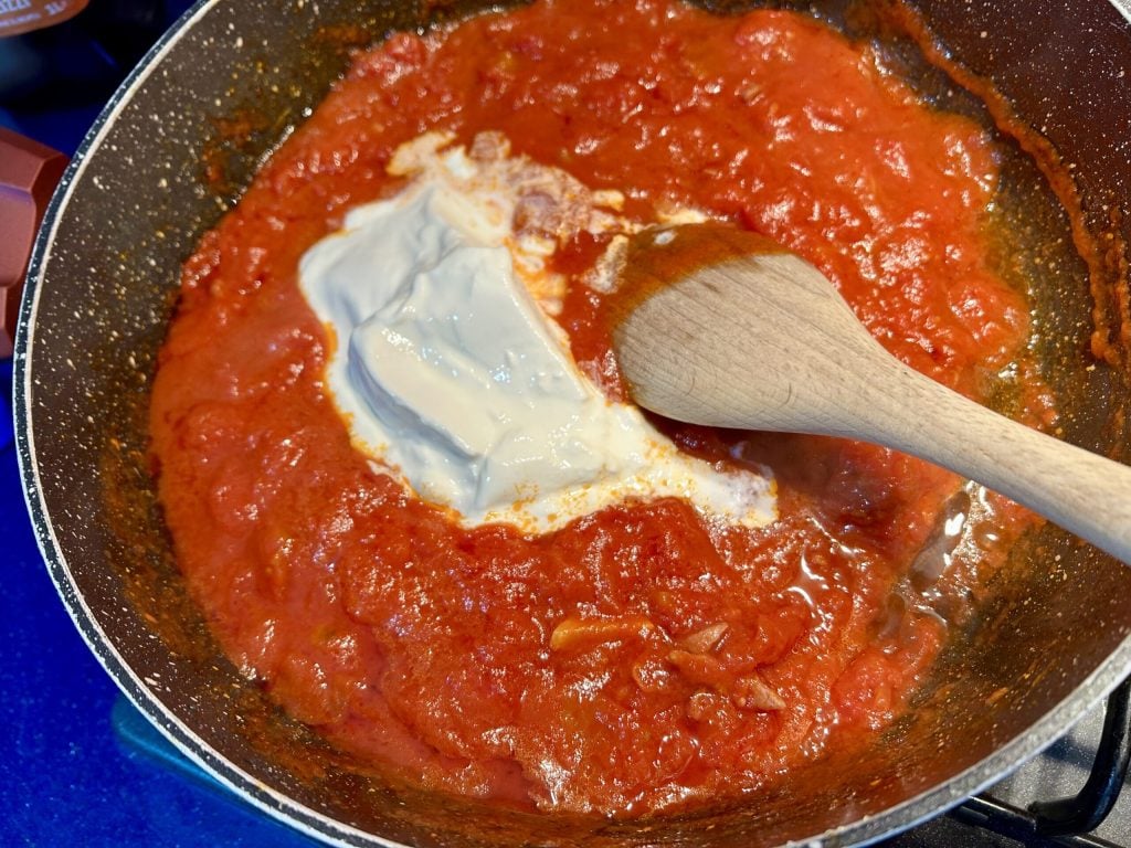 Quand vous éteignez la tomate, vous pouvez ajouter la crème et mélanger toujours hors du feu.