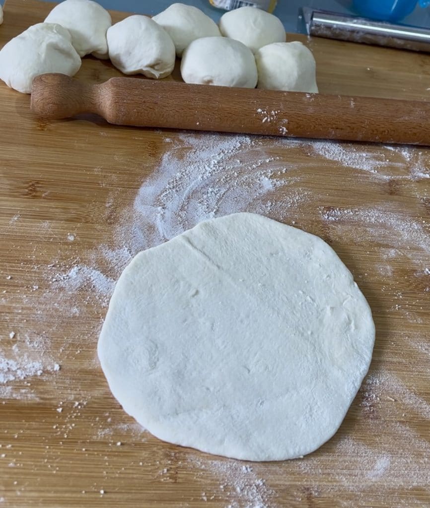 Reprenons la pâte et remettons-la sur le plan de travail légèrement fariné. Allongeons-la délicatement en forme de boudin, sans trop l’écraser, et avec un racloir ou un couteau, divisons-la en 8 ou 9 morceaux. Formons des petites boules avec chaque morceau et, une par une, étalons-les avec le rouleau à pâtisserie jusqu’à obtenir des feuilles très fines.